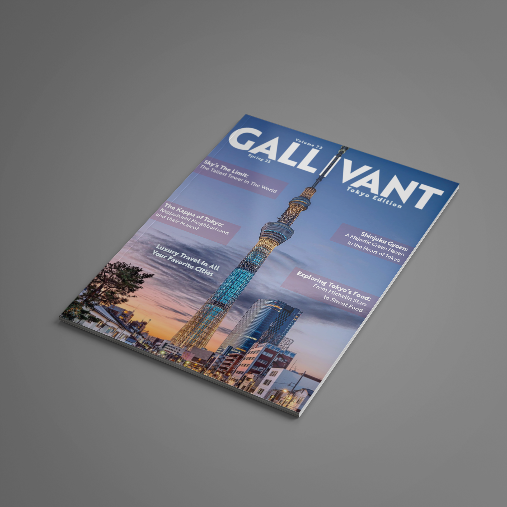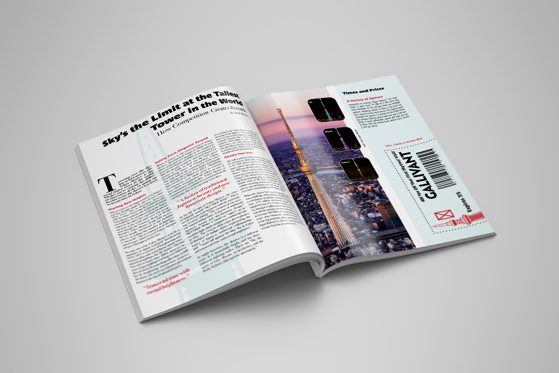 Result: For my pages, I wanted viewers to see the variety of architecture found in Tokyo. Utilizing the beautiful and tall Skytree with its multiple light schemes, as well as the V88 building with it’s unique curvature.