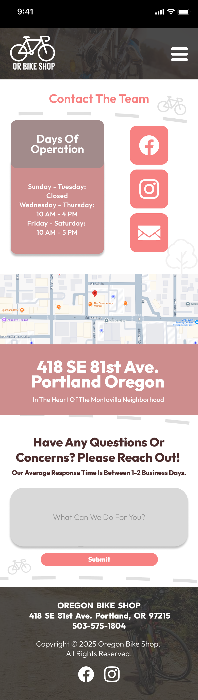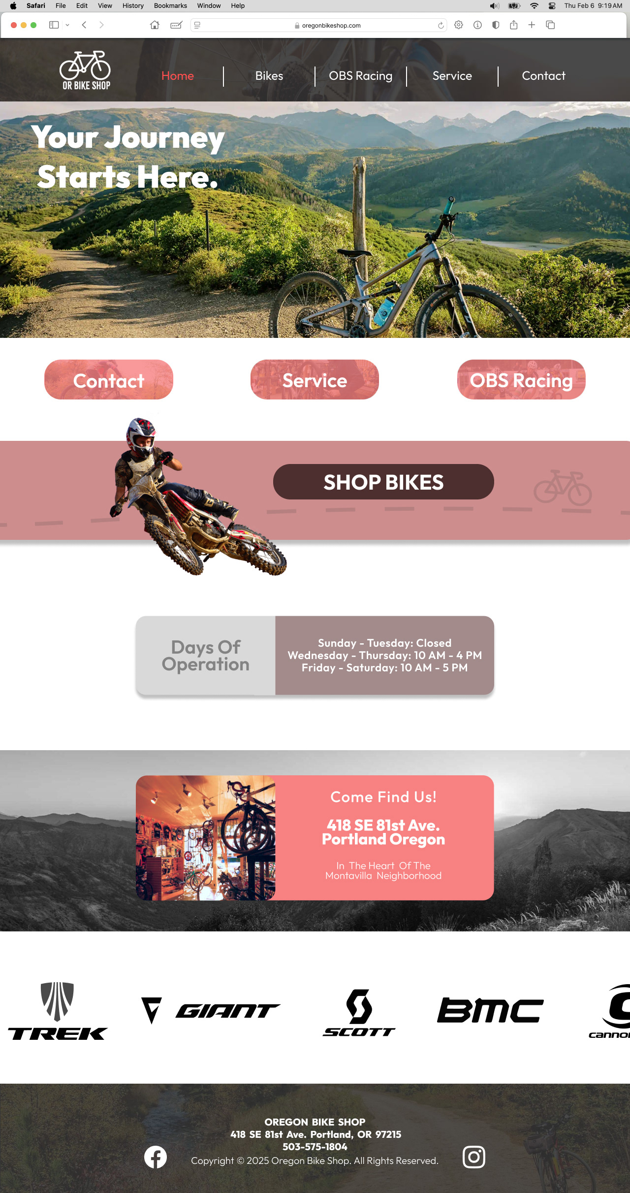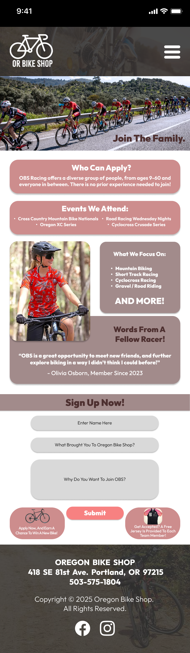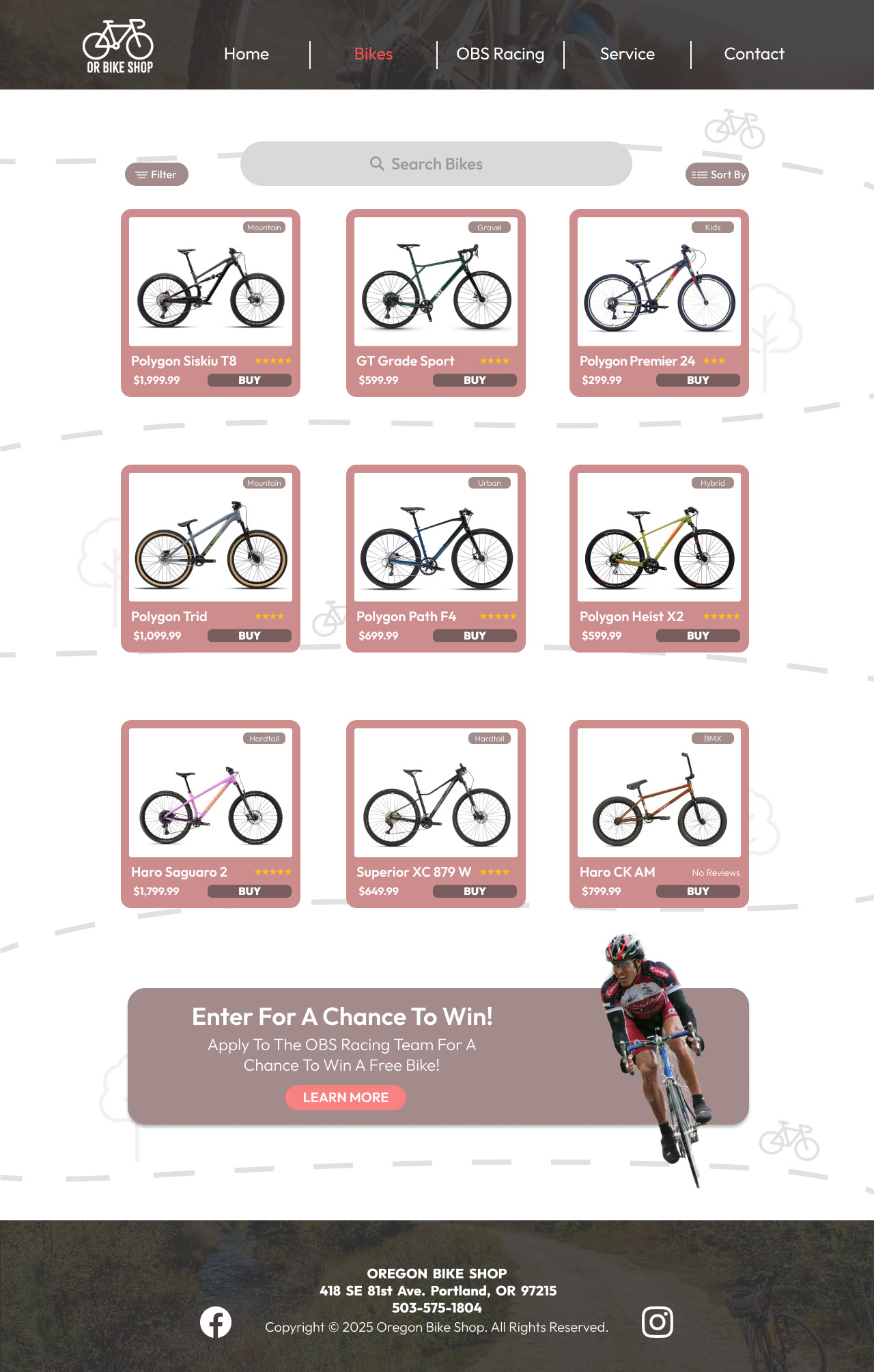 Challenge: Redesign the Oregon Bike Shop website, a local bike shop in Portland. Utilizing Figma, create both desktop and mobile pages, all being interactive with a consistent style.