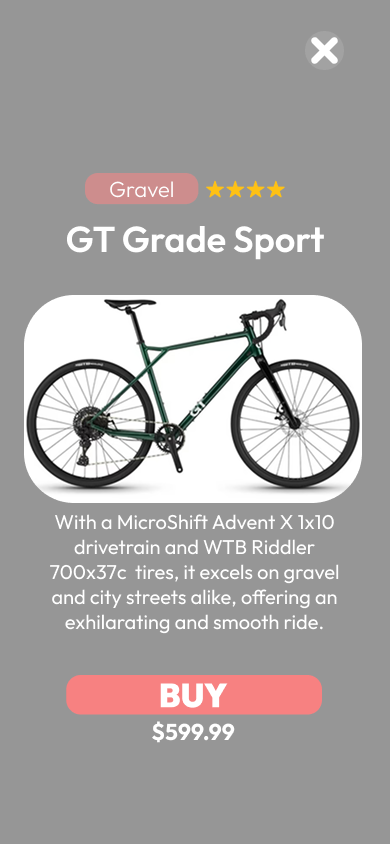 Result: My approach for this website was focusing on interactive elements, as well as cleaning up the original site which was just a singular page. There are a variety of viewable elements, especially on the bikes page.