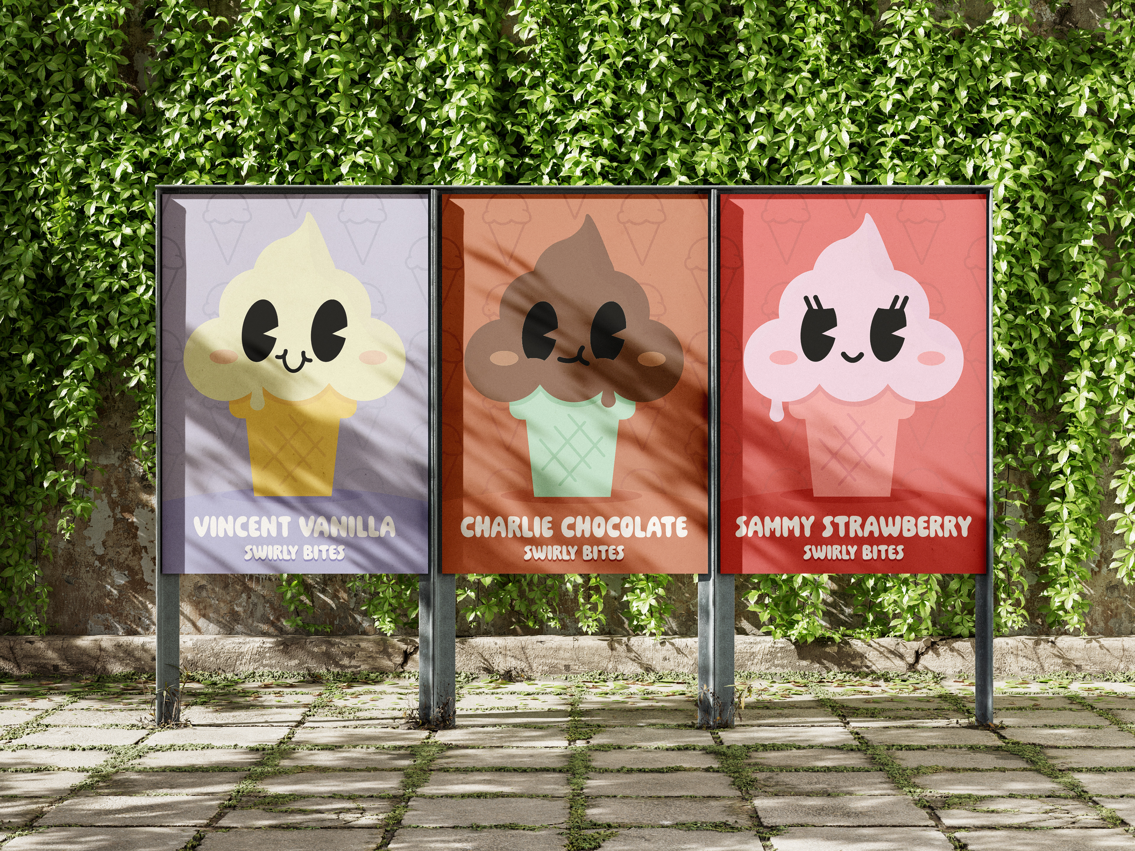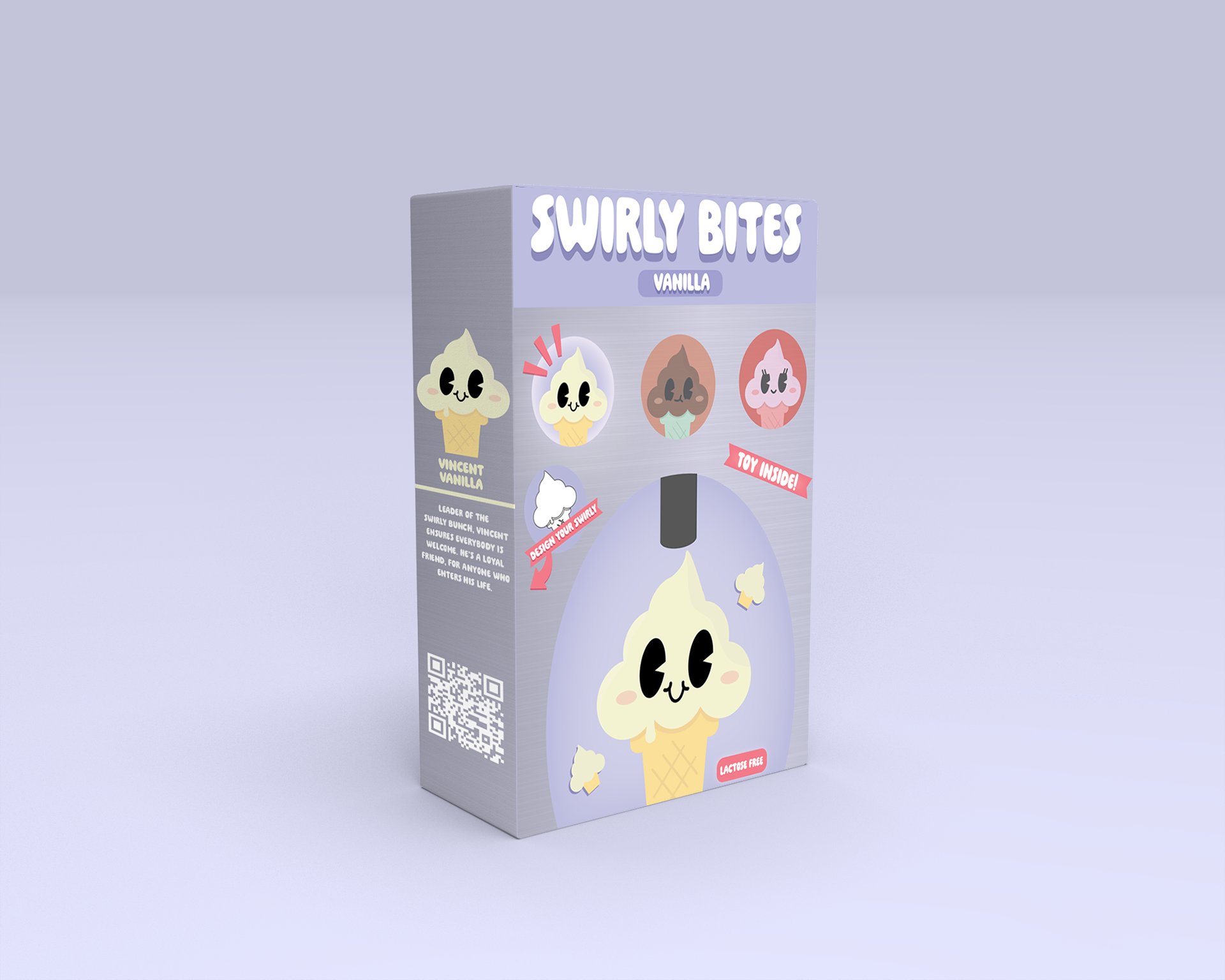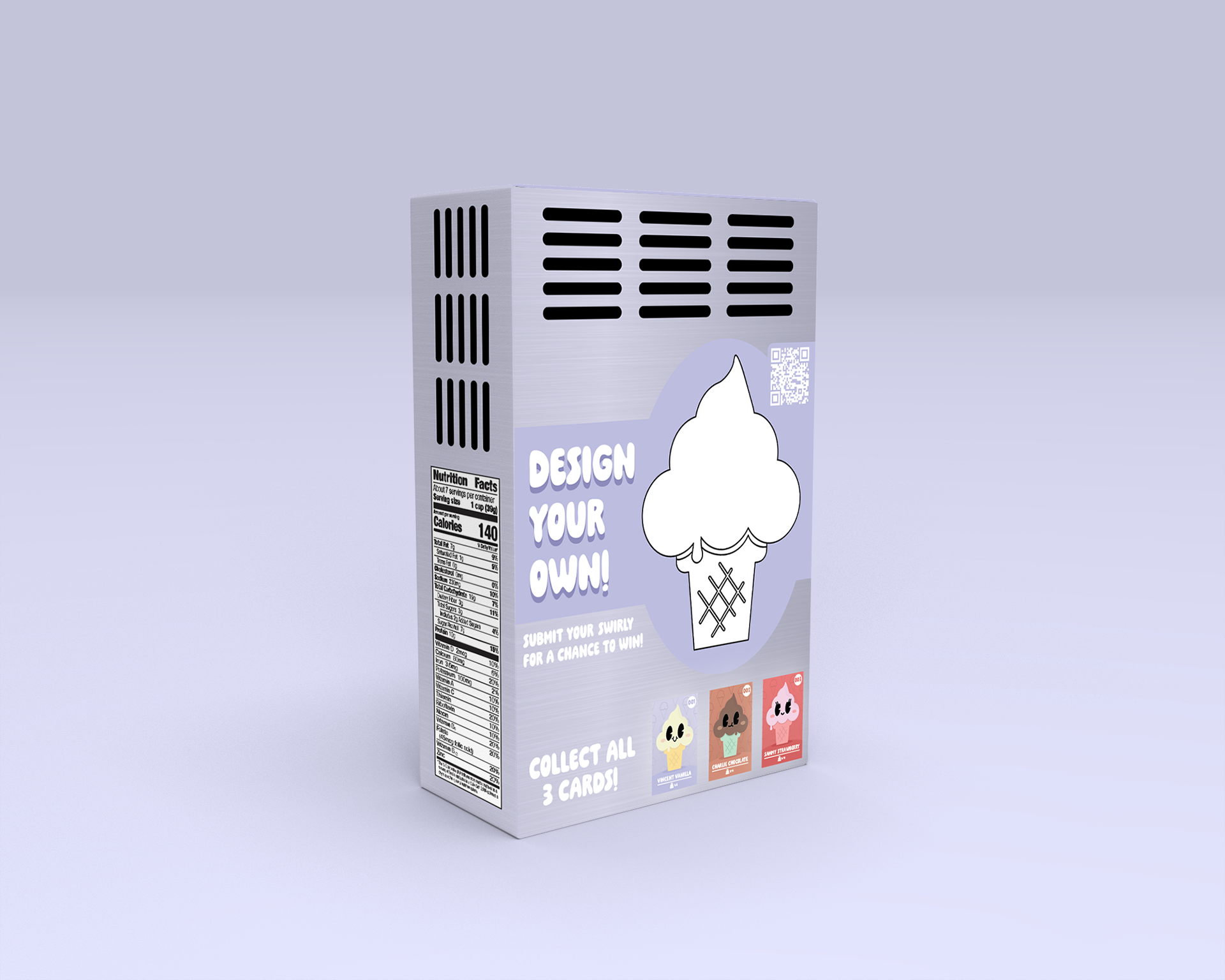 Result: My creative process included mimicking a soft serve machine. This is shown with the metallic texture, vents, buttons, and more. Incorporating cards as the toy inside, as well as the blank canvas on the back invites a younger audience to purchase Swirly Bites.